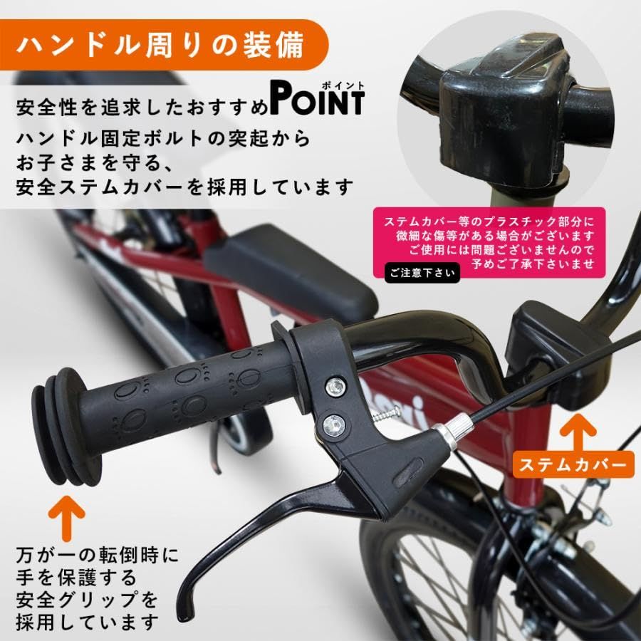 安全装備:セーフティーマット、全面チェーンカバー、安全グリップ、ステムカバー ・標準装備:前後泥除け、サイドスタンド、補助輪、ペダル、反射板、簡易工具、取扱説明書