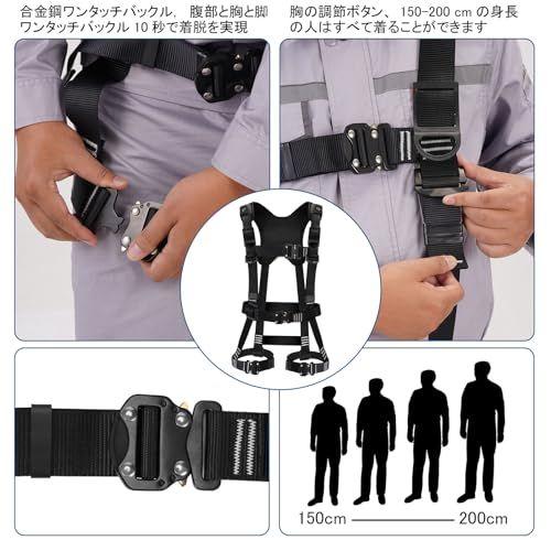 【調整可能なフルハーネス】当社のハーネス安全帯は、あらゆる体格の方に適しています。ユーザーが重量内で適切にフィットするように6点の調整を提供します。ショックアブソーバー付きますので、万が一落下あるいは墜落時、落下する衝撃は体全体に分散し、人体への負担を最低限に軽減します。
