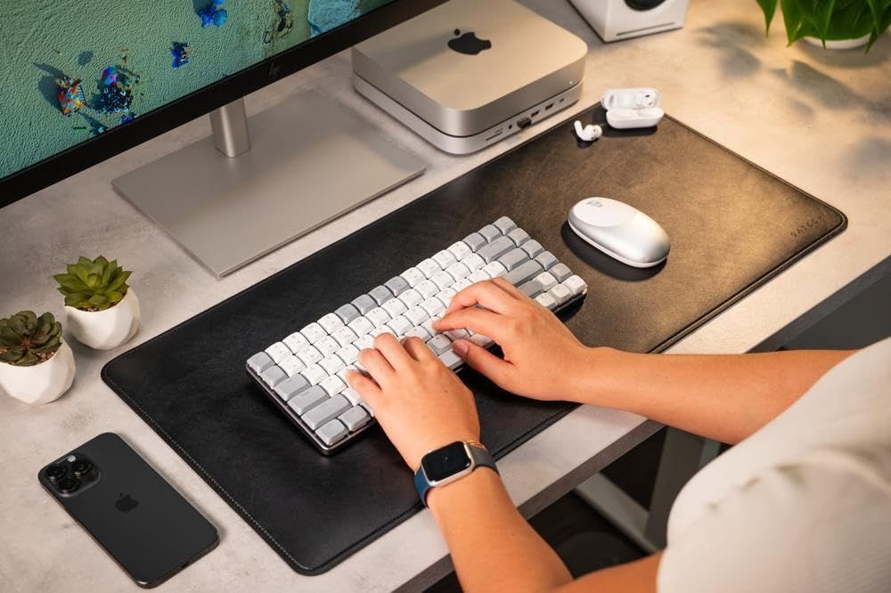 プレミアムデスクパッドマット Satechiのデスクマットで、オフィスデスクのアクセサリーを完璧に仕上げましょう。プレミアムヴィーガンレザーを使用し、ステッチを補強することで、コンピューターデスクにスタイリッシュな雰囲気を添えます。ご自宅やオフィスのインテリアにぴったり合う3色からお選びいただけます。