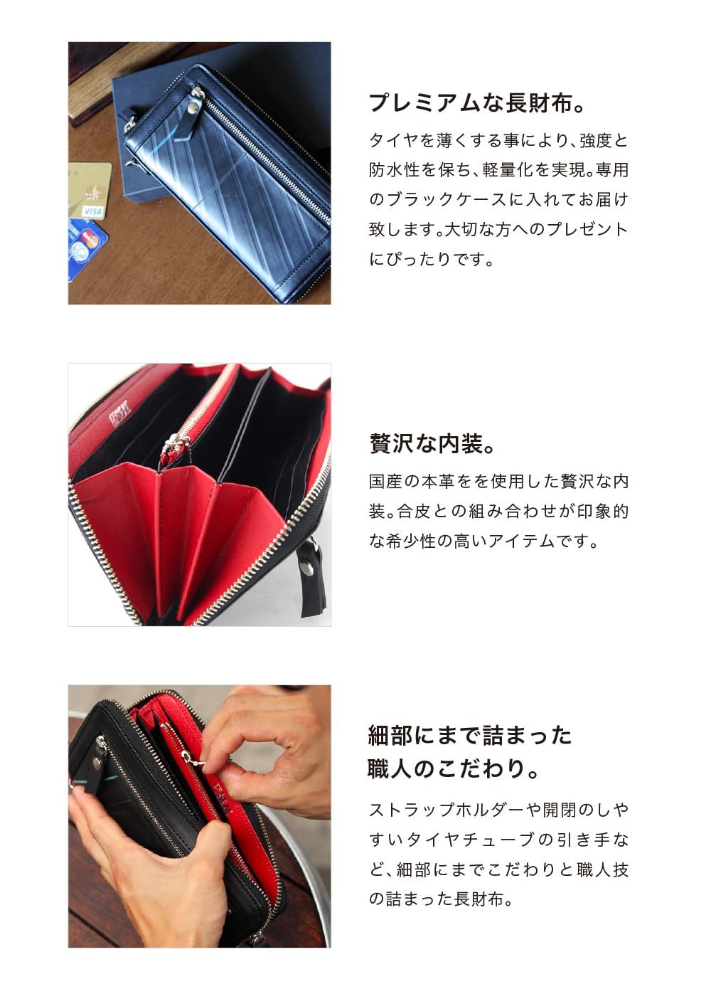 【アイテム説明】日本の職人の技術が凝縮された、プレミアムなロングウォレット。タイヤチューブを漉く(すく:薄くする)という特殊な加工により、タイヤチューブで仕上げたタフなボディながら、軽量化を実現。耐久性の高いタイヤチューブと本革との組み合わせは非常に高度な技術が必要な為、作れる職人は僅か。その為、各色数十個単位での少量での生産となり、とても希少性の高いアイテムとなります。 充実した容量の内部機能ながら、ファスナーを閉めれば安全に、スマートに持ち運びが可能。プレゼントにもぴったりの専用のブラックケースに入れてお届け致します。
