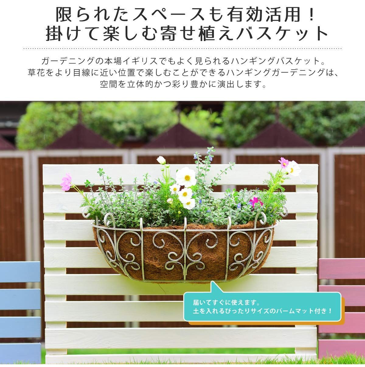 ゴージャスアイアンシリーズにハンギングバスケットが登場!アーチやフェンスなどと同様の素材を使用し、重厚感あふれる作りになっています。ヤシ繊維のパームマットが付属していますので、植え込んですぐにお使いいただけます。