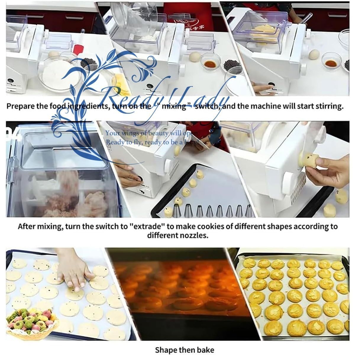 ビスケット型:ビスケット成形機には6種類のビスケット型が装備されており、モーター速度は50?60 rpmで、排出速度は速く、操作は簡単で、さまざまな形のビスケットを作る楽しみを楽しみ、毎日の手作りを満たすことができます。ニーズ。おいしいクッキーを手作りする