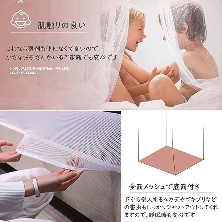 素材:蚊帳は丈夫なポリエステル素材、レース生地を採用して、化学的な臭気や有害物質は含まれていません。