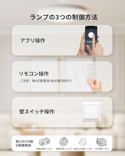 【リモコン&スマホ操作】?ペアリング手順:壁スイッチOFFON後2秒以内に「点灯」ボタンを35秒長押し(点滅で完了)※ブレーカー操作でも設定可能。?2.4GHzリモコン:最大20m対応・ホルダー付属(電池別売)。?アプリ連携:専用アプリ「LampSmart Pro」でスマホからも操作可能。