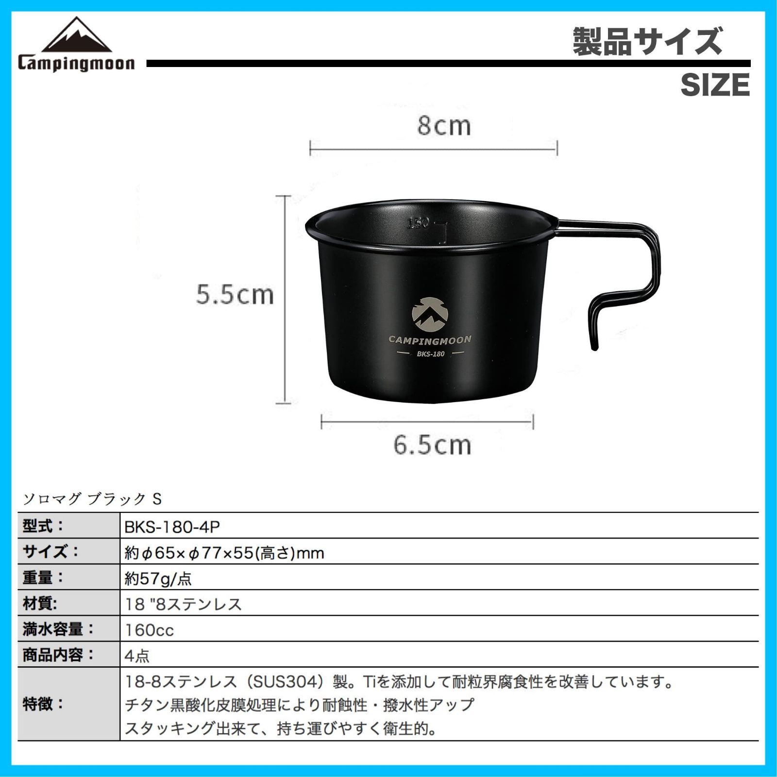 マグカップ ブラック S 黒 ソロマグ 4点セット コーヒー 160 ml キャンプ SOLO MOON MUG キャンピングムーン CAMPING BKS 180 4 P