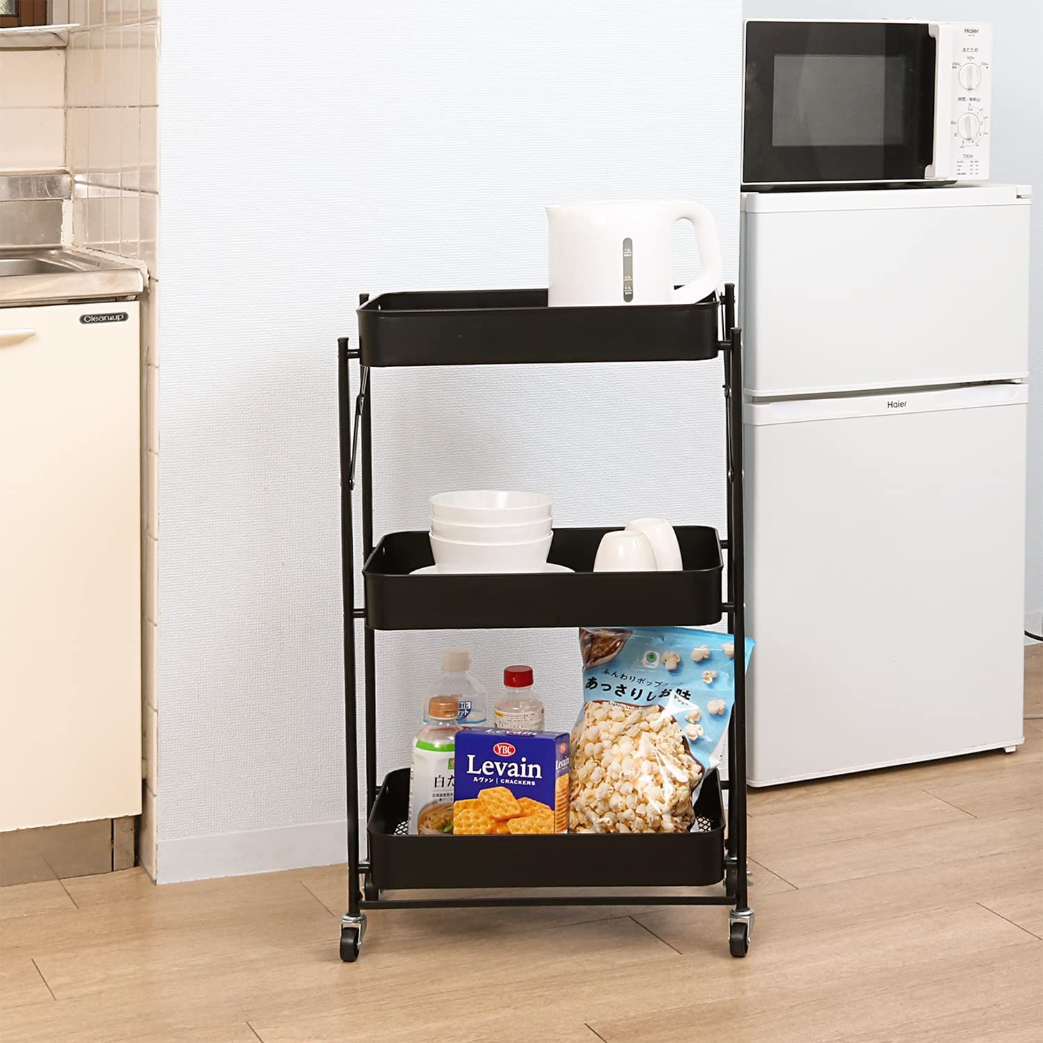 3段 キッチンワゴン ブラック 折りたたみ スチールワゴン キャスター付き アストロ 収納カート 731 16 スリム