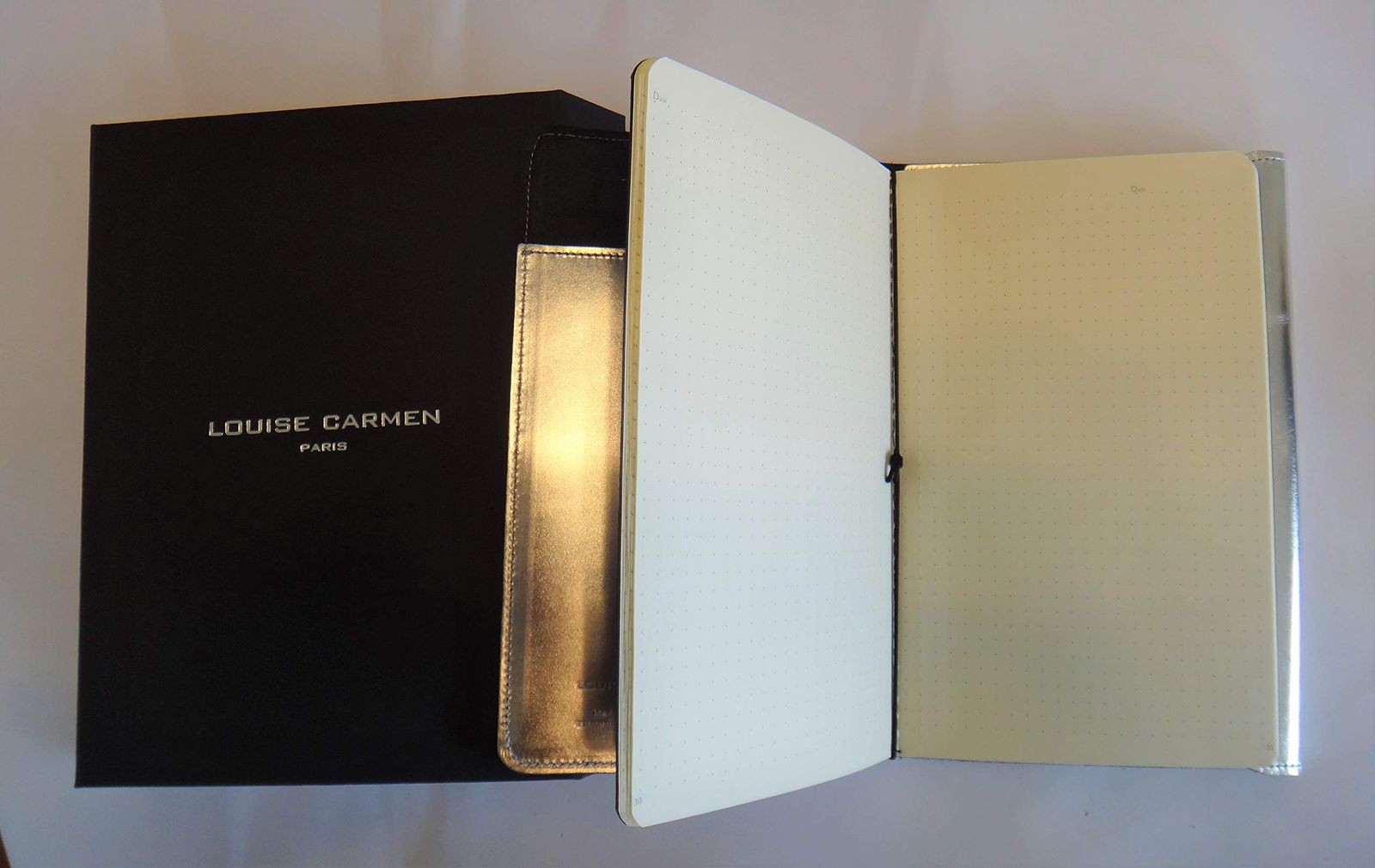 サイズ:21.5㎝×14㎝×1㎝ , A5スリムサイズ、ブランドのロゴ付き黒の箱入り、カバーは10色展開、ノート1冊付き(60ページ)