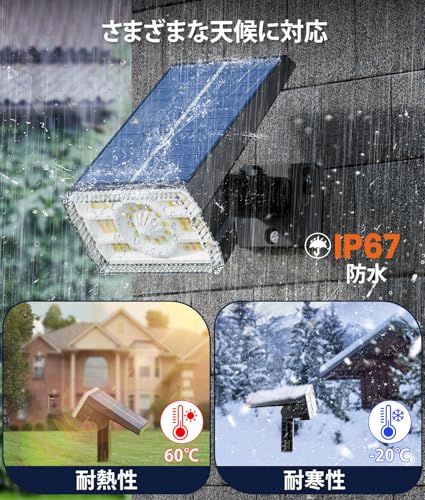 【IP67防水防塵】 このガーデンライトはIP67の防塵・防水認証を取得し、優れた防護性能を備えており、雨の日にも安定して動作します。また、厳しい日差しや冬の寒さにも強く、-20から60の温度環境でも正常に動作します。湿気の多い日も、暑い日も、寒い日も、安心して使えます。庭や花壇、車道など、様々な屋外照明シーンに適しています。