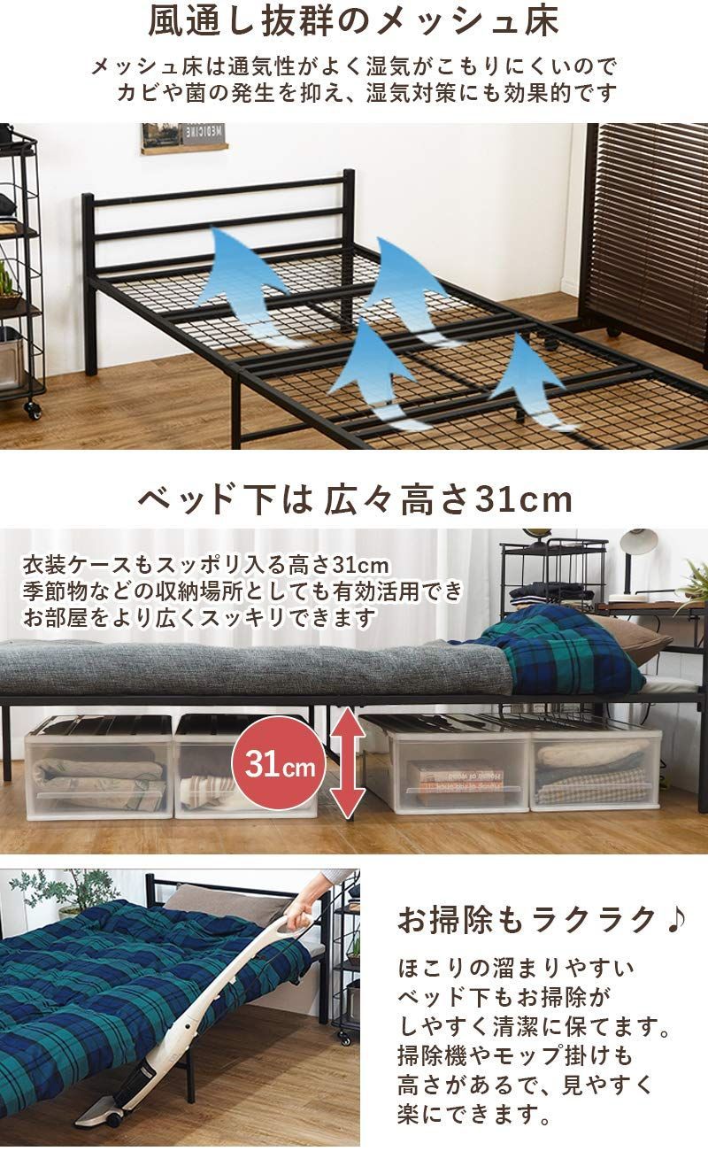 【床下の広々スペース】ベッド下は約31cmと広くスペースを取っているので、掃除機をかけたりワイパーがけがラク。