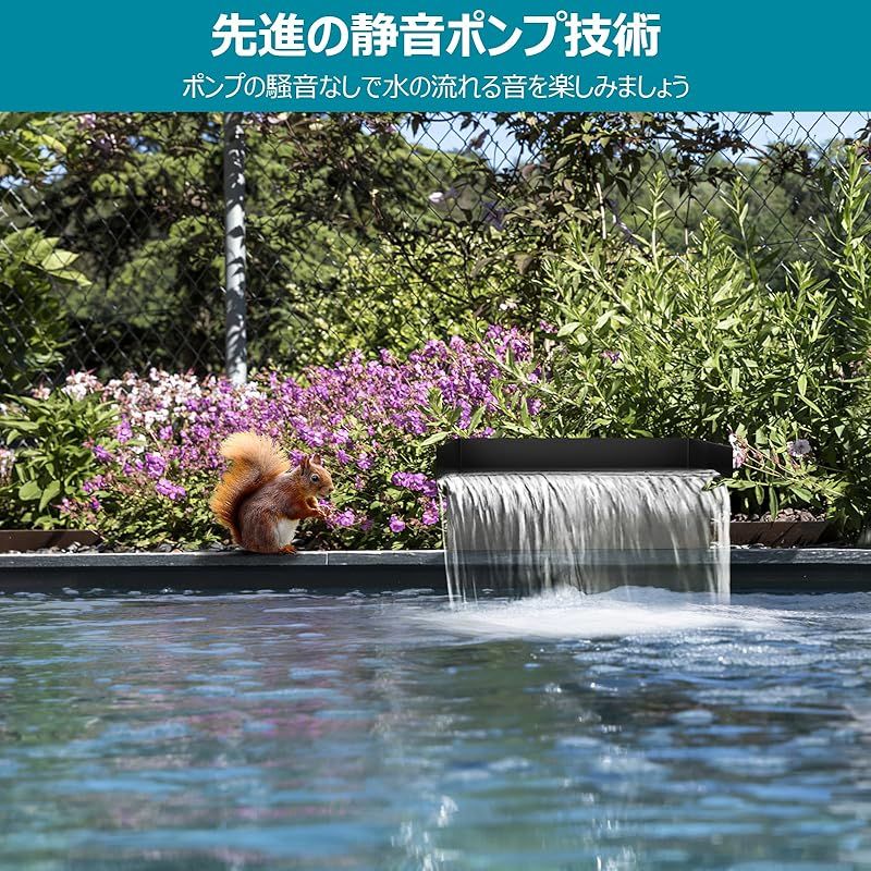 「高効率池ポンプシステム」NFESOLAR池の滝の排水路には、安定した流量の高性能40W 660GPH池ポンプが装備されており、水の流れを簡単に押し出して壮大な滝効果を形成します。フィルターバッグにより、水中のゴミを効果的にろ過し、ポンプが詰まるのを防ぎます。ウォーターポンプは低騒音で動作し、静かな鑑賞体験をします。