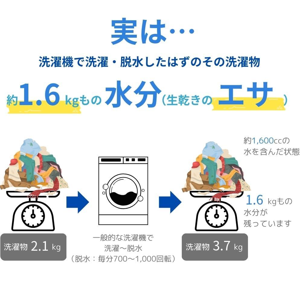 【 超高速脱水の脱水力】 一般的な洗濯機で洗濯、脱水したものの約2倍の脱水力 ●生乾き特有の嫌な匂いにさよなら 生乾きの原因=しっかり乾燥できず水分を含んだまま時間が経過してしまうと雑菌が繁殖→生乾き特有の嫌なニオイの元に しっかり脱水することで生乾き特有の嫌な匂いを防ぎます。 ●通常の倍絞れるから乾きが早い 乾燥時間が1/2になり時間短縮につながります。