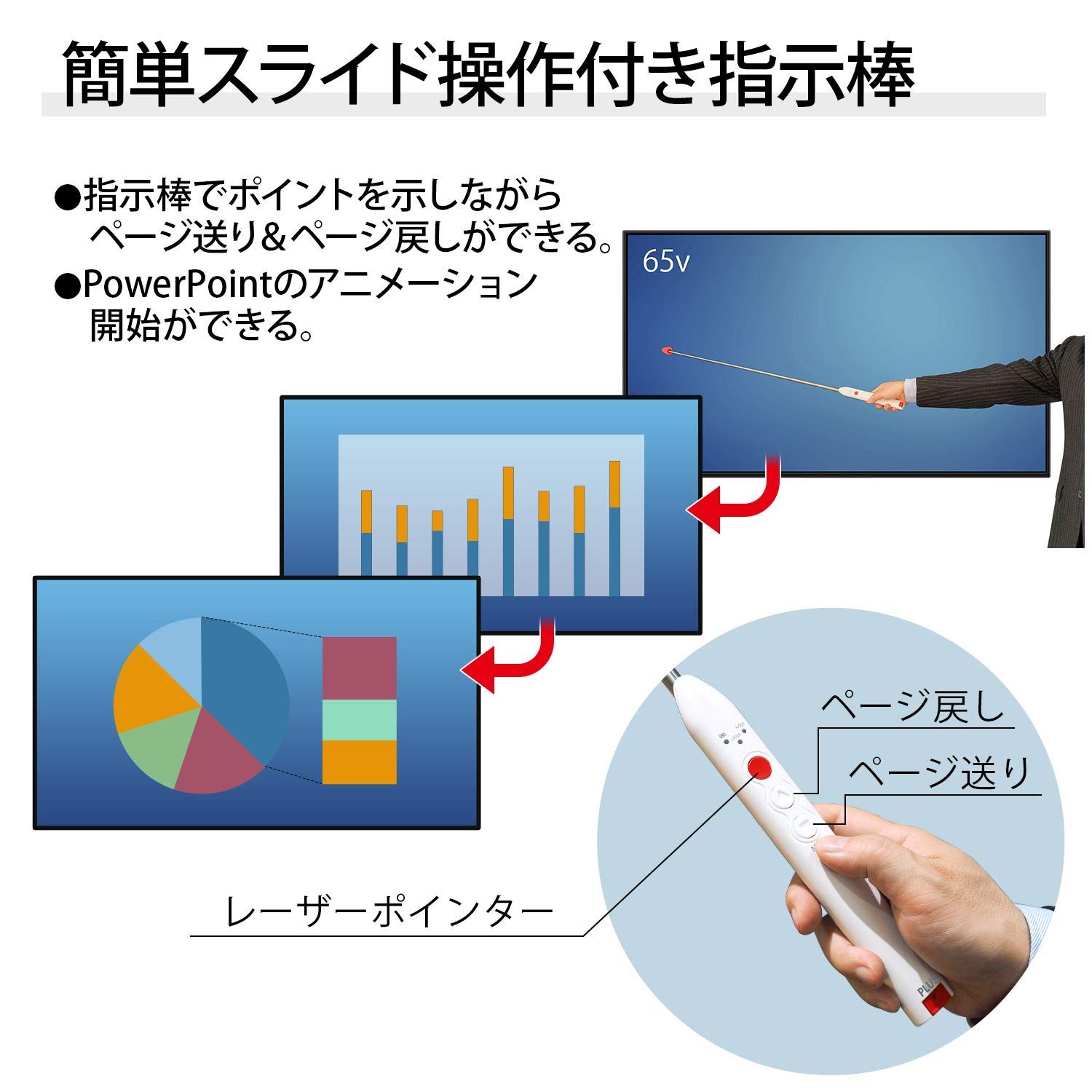 ・ 指示棒でポイントを示しながら、手元のボタンでパワーポイントのページ送り/戻しの操作が可能