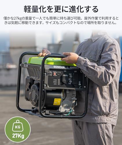 【オープン型でも軽量化を実現】発電機の内部構造は全面的に進化されて、僅かな27kgの重量で一人でも簡単に持ち運び可能、屋外作業で利用するときは気軽に移動できます。従来2.5kVAクラスのオープン型発電機と相当なサイズで、車や倉庫に置いてもスペースを取りません。剛性の高いフレームを採用し現場のハードな使用にも耐えられます。