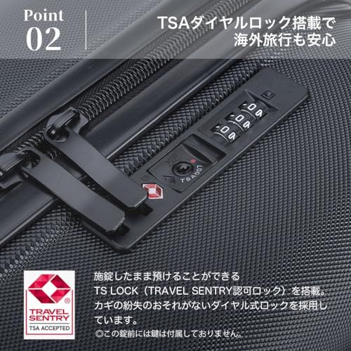 大切な荷物をしっかりと守るコーナーパッドと世界基準のTSAロック搭載。こちらのタイプのTSAロックはダイヤル式です。鍵穴がありますが、鍵は付属しません。鍵穴は空港職員用となります。