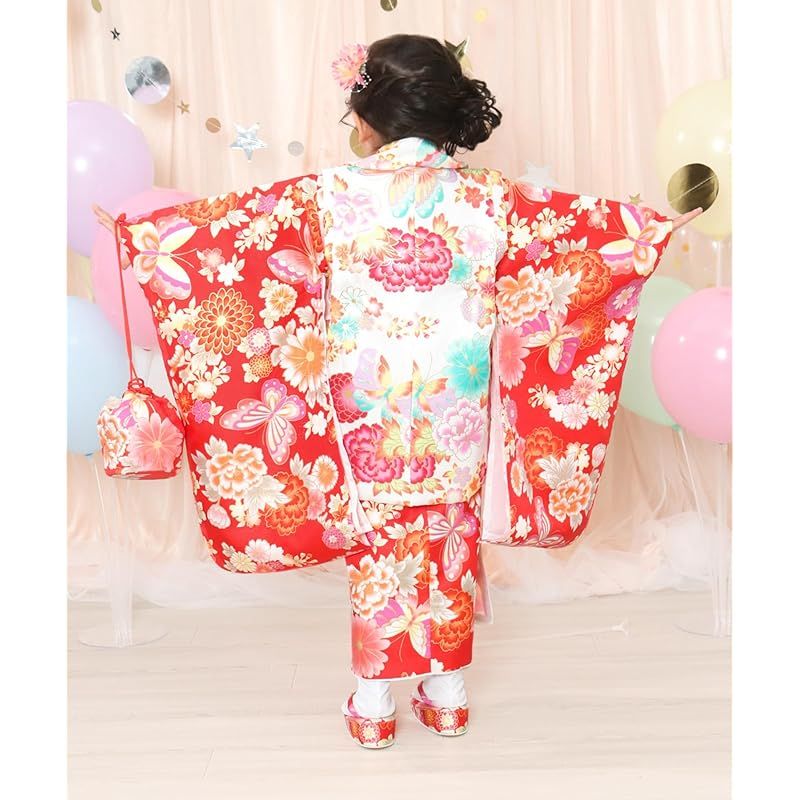 KYOETSU キョウエツ 着物セット 七五三用 3歳用 被布セット 華やかC 9点セット 柄被布 柄着物 伊達衿 長襦袢 髪飾り 巾着 草履 腰紐 足袋 ガールズ ワンサイズ 12 蝶舞う緋色の華 0