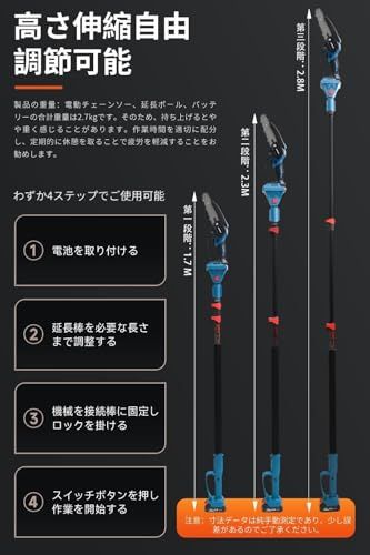 【多重安全保護機能の搭載】:高枝切り電動チェーンソーには、二重ロックシステムが備わっており、誤操作を防止します。高枝ポールには、意図しない落下を防ぐ安全装置が装備されています。この高枝切り電動チェーンソーの使用では、安全が常に最優先されます。