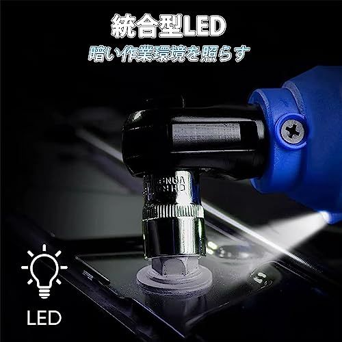 【速攻取り付け&LEDライト付】ナットのサイズに対応したソケットを差し込むだけで、すぐ応用でき、工具を使わず、自由に交換できる便利さを持ってます。本体の差し込み角が9.52mm(3/8インチ)で、ほとんどの市販のソケットを使用でき、使えるに幅広いラチェットレンチです。また、手元が暗くても、ライト付きで安心に使えます。LEDライトを搭載、トリガーに連動してドライバーの先端のLEDライトが点灯します。手元をしっかり照らしてくれるので、昼夜を問わず作業が可能です。
