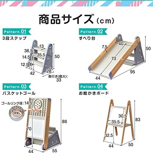 【商品詳細】 サイズ:ステップ:(約)42cmx33cmx50cm/すべり台:(約)44cmx95cmx50cm/バスケットゴール:(約)44cmx55cmx88cm/お絵かきボード:(約)44cmx50cmx83cm材質:高密度ポリエチレン(HDPE)、PE重量:(約)4.3kg※総重量耐荷重:(約)25g※ステップ、すべり台使用時対象年齢:1歳8歳特記事項:・こちらの商品はお客様による組み立てが必要な商品です。・安全のため、組み立ては2人以上で行ってください。※商品は、モニターによって色合いが異なって見える場合があります。 また、仕様・デザインは改良のため予告なく変更することがあります。