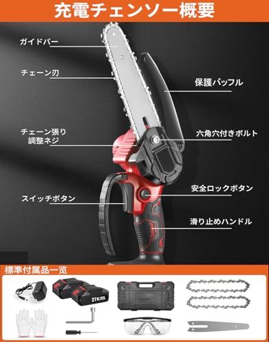 【軽量で片手で使えるィチェーンソー 】このポータブルなミニワイヤレスチェーンソーは、バッテリーを含めてわずか1.1KGと非常に軽量で、かさばらず滑り止めのハンドルを備えています。女性でも片手で簡単に操作できます。それに、チェーンソー全体が取り付けられているので、ボックス内のレンチを使用してネジを回して、締め具合を調整して、最後にネジを締めるだけです。チェーンを個別に取り付ける必要はありませんです。