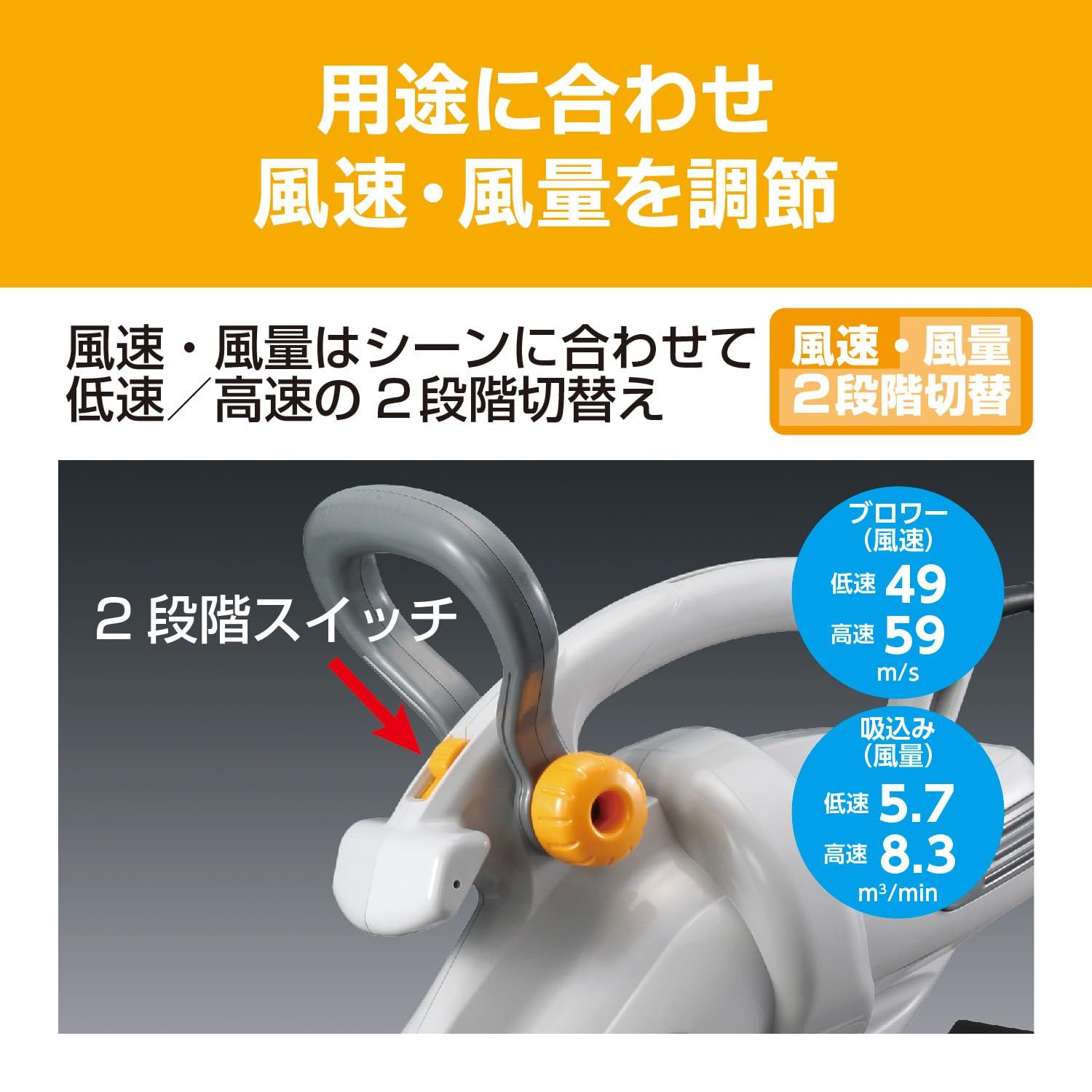 ●作業シーンに合わせてノズルが0~100mmで伸縮可能な吹き寄せ、集じん、粉砕が1台でできるブロワバキュームに延長コード10mを2本付属したお得なセット品です
