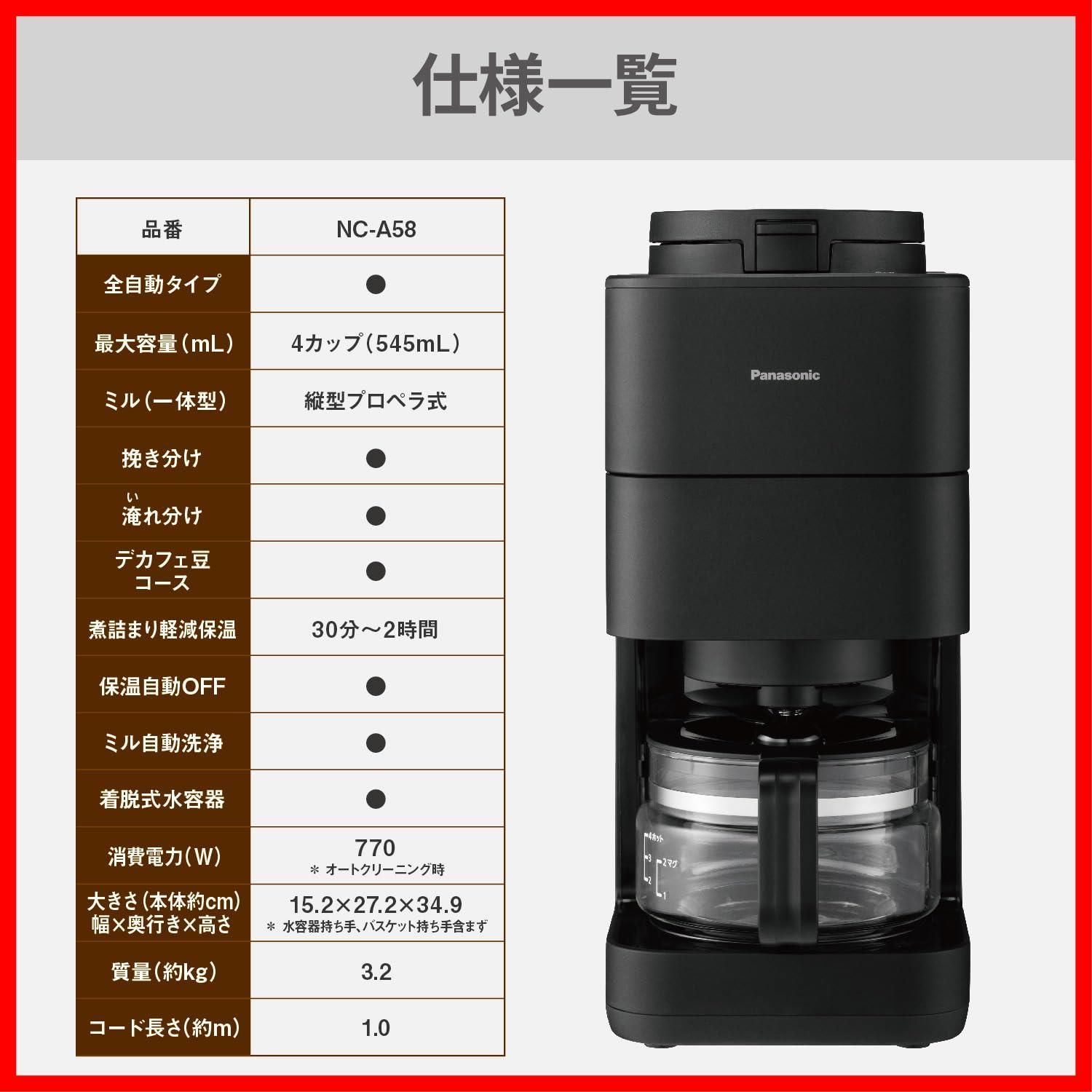 NC A 58 K ブラック デカフェ豆コース搭載 沸騰浄水機能 ミル付き 全自動 コーヒーメーカー パナソニック