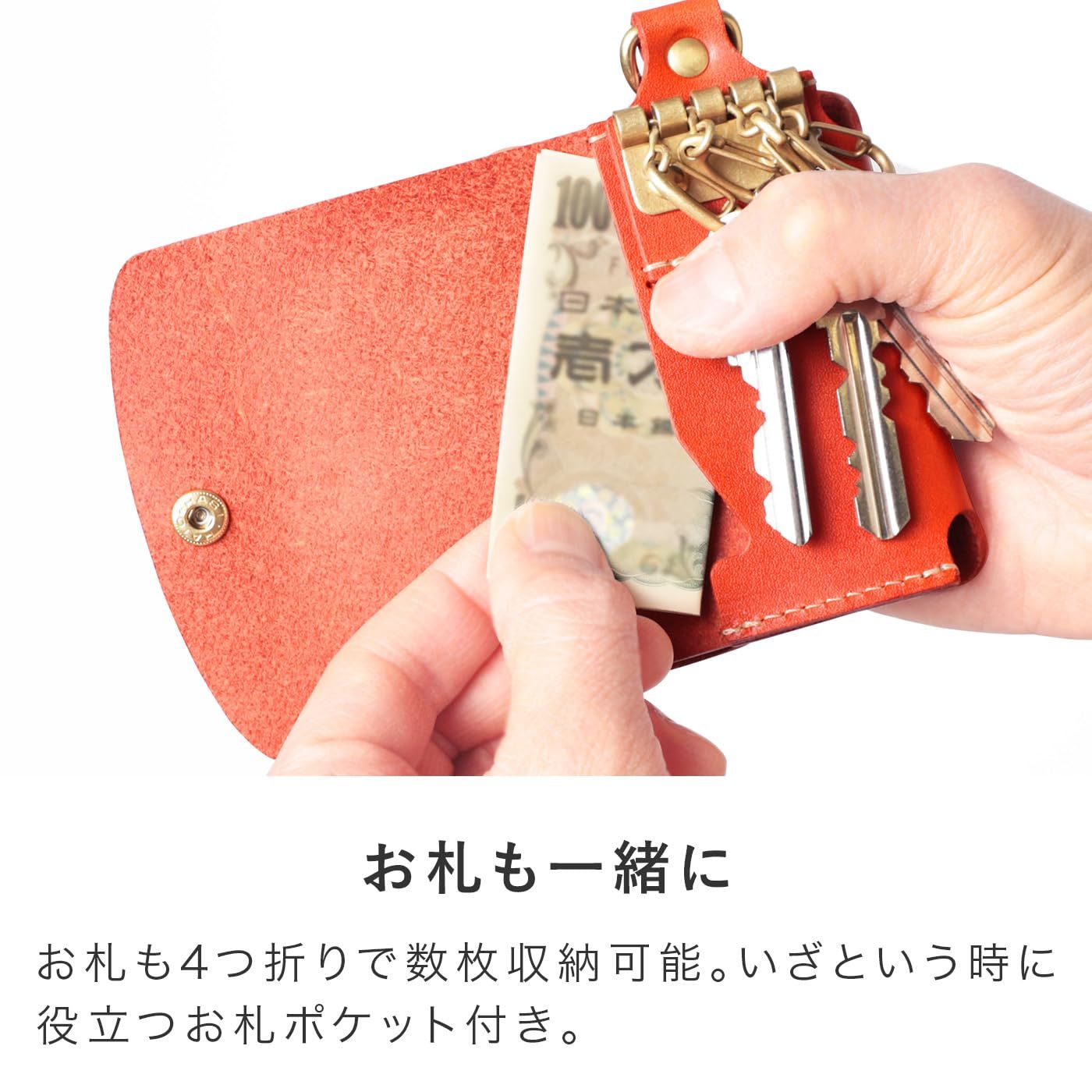 【機能性×デザイン】家の鍵やお札も一緒に収納でき、フラップを開けると4連のキースペースがあり、いざという時に役立つお札ポケットにはお札を4つ折りで数枚収納可能です。ボールチェーンで繋げられる大きめのポケットは、取り出しやすく便利です。車を乗り換えても長く使えるため、愛着を持ってご使用いただけます。