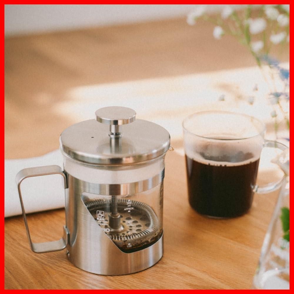 【商品詳細】 本体サイズ:幅13.6×奥行9.2×高12.8、口径9.0cm、本体重量:約430g、実用容量:300mL、本体材質:本体/耐熱ガラス、ツマミ・フタ・ホルダー・シャフト・フィルター一式/ステンレス、日本製