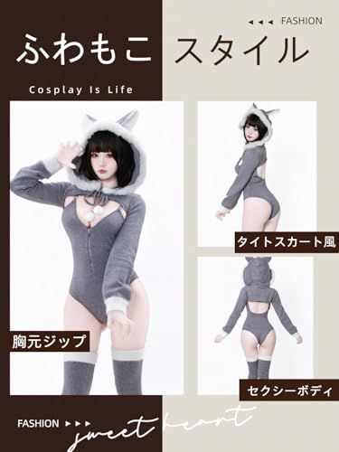 SENMHS ふわもこ オオカミ コスプレ レディース 可愛い 狼耳 フード付き ニット パーカー 白ファー ジッパー 連体スーツ ソックス付き セクシー ルームウェア もこもこ コスチューム 撮影会 部屋着 cosplay 81 e 2 c 423