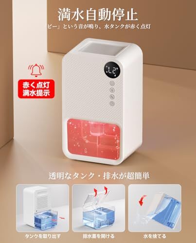 【小型&軽量&省エネ・LED表示画面】この小型除湿機はA4サイズのようなコンパクトなサイズで、寝室、クローゼット、洗面所、オフィス、地下室、トイレ、靴箱などの換気の悪い場所に最適です。収納時にも邪魔になりません。その他にも、除湿機には「自動解凍機能」が備わっており、起動時には自動的に結露を取り除きます。わずか22.5Wの消費電力で、1時間あたりの電気代は約0.22円!経済的で省エネな除湿機です。さらに、LEDディスプレイがおしゃれで実用的です。