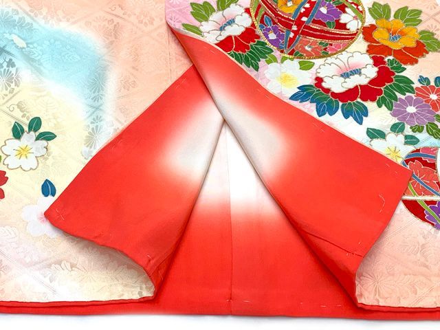 七五三 着物 7歳 セット 正絹 絵羽柄 手描き ぼかし染め 四つ身着物と結び帯 コーデセット オレンジ系 鞠と牡丹 IYS 974 i 28 638 GZ