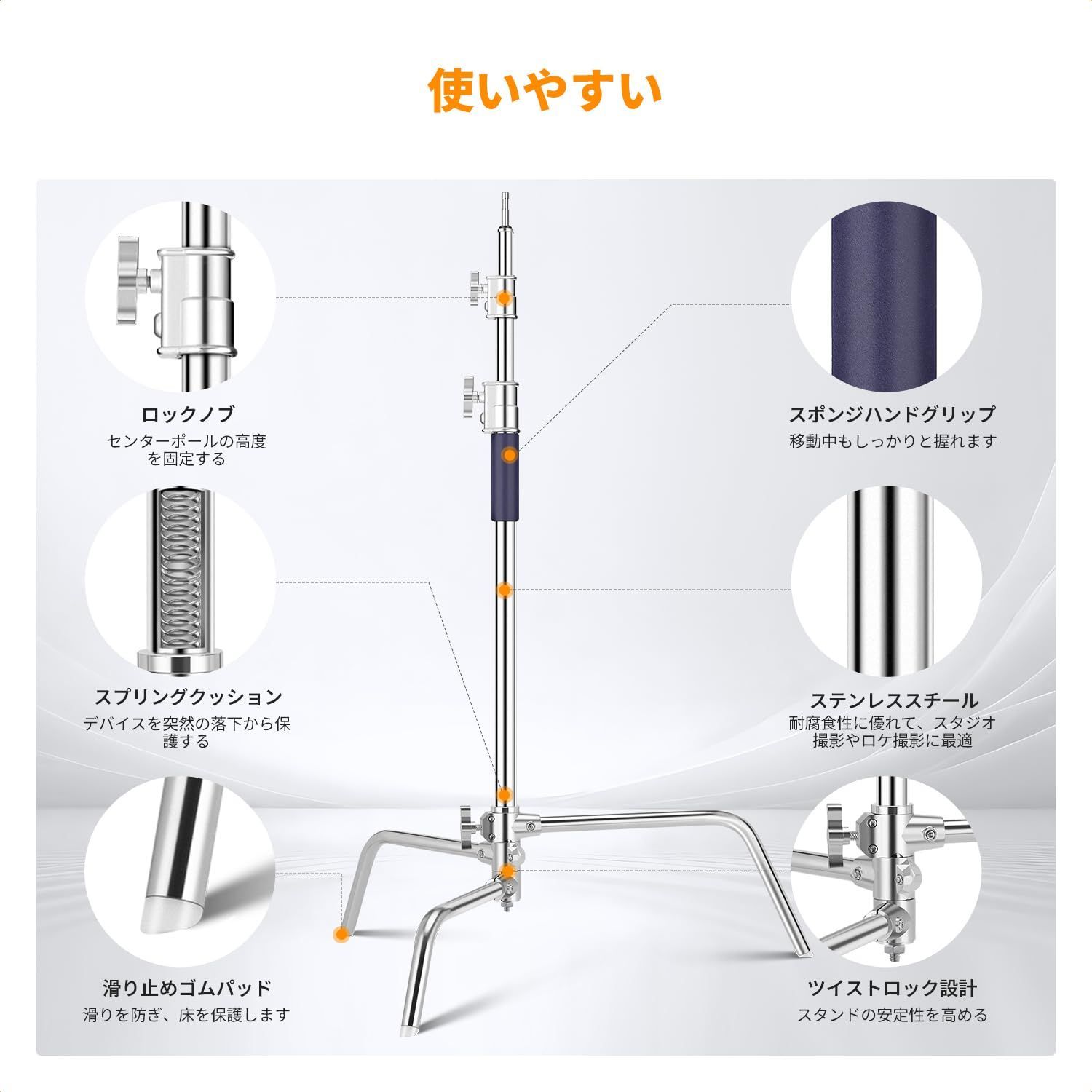 【高さ調節可能】Cスタンドの高さは149cmから330cmまで調節可能で、さまざまなシーンの撮影のニーズを満たすことができます。メインロッドに内蔵されたスプリングクッションは、取り付け機器の突然の落下の衝撃を軽減し、高さを調整する際に撮影機材を保護します。