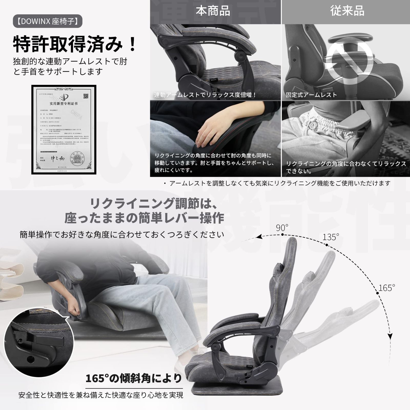 Dowinx ゲーミング座椅子 ゲーミングチェア 腰が痛くならない 回転座椅子 おしゃれ ゲーム ゲーミング パソコンチェア 連動アームレスト ランバーサポート 165°リクライニング チェア ハイバック グレー LS-667903