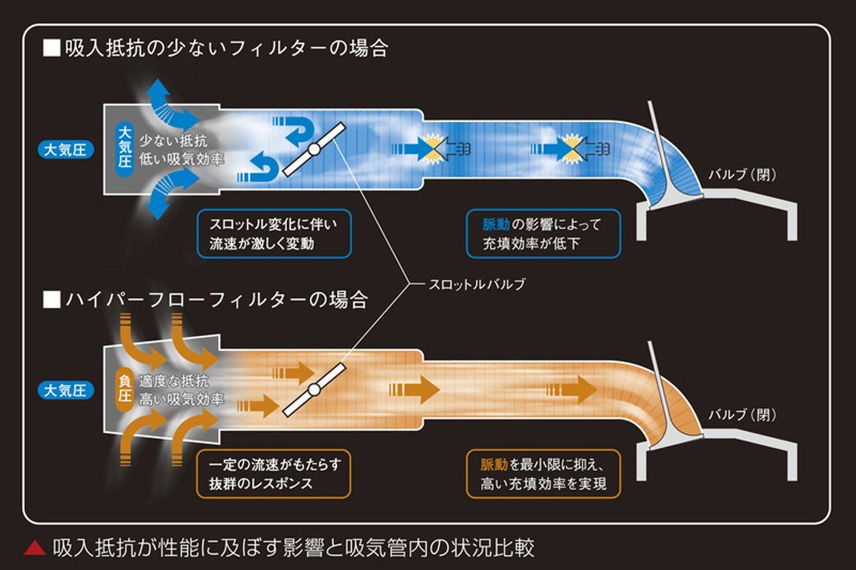 ハイエースのガソリンエンジンを活性化するためには、基本に忠実な吸排気チューニングが効果的です。近頃ではチューニングの定番となったスポーツフィルターへの交換ですが、実は間違った知識によるものも少なくありません。自然吸気エンジンのフィルターに求められる性能とは、吸塵能力と適度な吸入抵抗です。吸塵能力が必要なことは一般的に認知されていますが、吸入抵抗が重要であることはあまり知られておりません。吸気管内ではスロットルが開いた状態でも、吸気バルブの開閉によって空気の脈動が発生しています。カムプロフィール(作用角)※が変化しない限り、回転数の上昇に比例してバルブの閉じている時間が増すため、シリンダー内に吸引されなかった混合気がバルブの直前に溜まり、それが圧力となって逆流する現象が起こります。吸入抵抗の少ないフィルターを装着した場合、吸気管内と外気での圧力差が生じないために脈動を抑えることができず、逆流した圧力が壁となって充填効率を低下させてしまいます。同様の状況が、スロットルバルブ付近でも発生します。吸入抵抗減少=吸気効率向上という、過給機付きエンジンに対して有効な論理を前提に設計された低抵抗タイプのフィルターでは、サクション内に十分な負圧を発生させることが難しく、スロットル変化に対して吸入量が激しく変動します。その結果、吸気に一定の流速を維持させることが困難となり、広い回転域でレスポンスの悪化を招きます。 “ハイパーフローフィルターは、充填効率の向上を最優先に考えて開発した純正交換タイプの乾式エアフィルターです。特殊積層構造の繊維フィルターを採用することで、チューニング理論にもとづく最適な吸入抵抗を維持しつつ、吸入面積を限界まで拡大し、高回転・高負荷時でも十分な空気吸入量を確保しました。ハイエース専用設計だからこそ実現した、エンジン出力の向上と軽快なレスポンス、そして心地良い吸気音は、操る者すべてに格別なドライブフィールを約束します。
