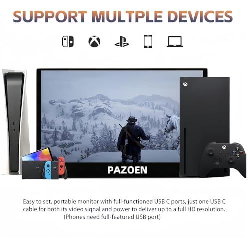 3. 【多様な接続方式・簡単設定】 PAZOENモバイルモニターは、豊富な入力端子を備えており、ノートパソコン、デスクトップ、スマホ、Switch、 PS4、PS5、ズベリーバイ、Xbox One、またはWiなどに対応しています。 (ご注意: ?音量調整ができない場合は再起動してみてください。 @バッテリーは内蔵されていないため、Switchに接続する際はSwitchのオリジナル電源アダプターを使用してモニターに給電する必要があります。)ゲームをプレイ中にXboxおよびPSゲーム機に接続すると黒い画面が表示される問題の解決方法:1. Xboxに接続し、可変リフレッシュレート(VRR)機能をオフにします。設定 - 一般 - テレビとディスプレイのオプションピデオモード - 可変リフレッシュレートをオフにしてください。2. PS5に接続し、VRR機能をオフにします。設定 - 画面とビデオ - ビデオ出カV