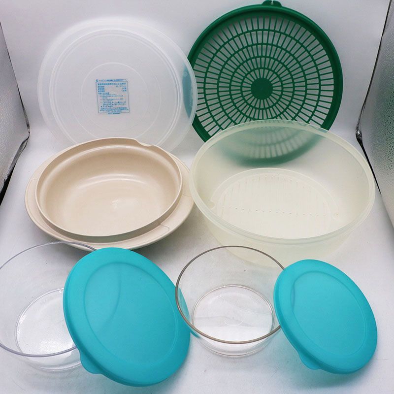 ・タッパーウエア 円型容器(新品良品、薄い汚れが有ります。セット内容:610ml×1・990ml×1・蓋(ターコイズ)×2)