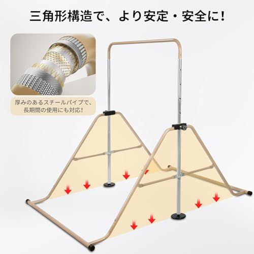 安定設計で安全性を確保:鉄棒の底部には6つの接地ポイント、さらに4つの滑り止めゴムパッドと2つの滑り止めディスクを備え、安定性を強化。滑りを防ぎ、安全に使用できます。また、三角形構造を採用し、頑丈で安定感があり、最大80kgまでの耐荷重を誇ります。