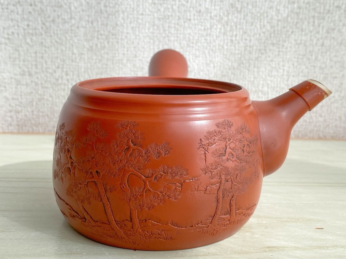 愛知県の伝統工芸品、常滑焼の昭邨作による朱泥急須です。胴には細字彫刻が施されており、美術性の高い逸品です。