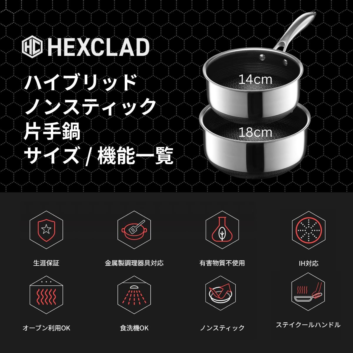 HexClad ハイブリッド ノンスティック 片手鍋 14 cm 0 95 L 焦げ付き防止加工 IH オーブン 食洗器 対応 メーカー直販 付き ヘックスクラッド 強化ガラス 蓋付き
