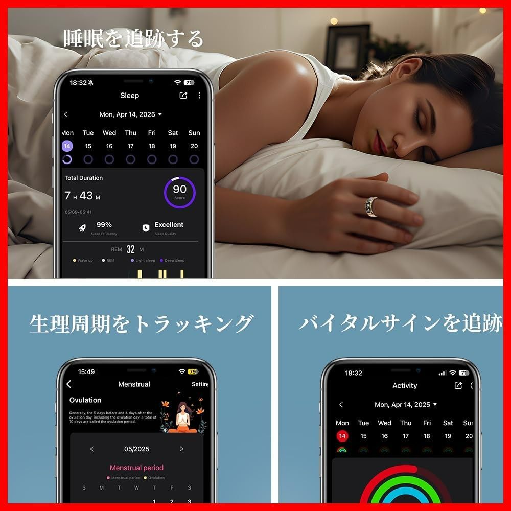 【高度な睡眠分析 | よりスマートな回復】AIを活用したインサイトとカスタマイズされた推奨事項を備えた、24時間365日睡眠ステージ(深い睡眠/浅い睡眠/レム睡眠)をモニタリング。毎朝、爽快に目覚めることができます。