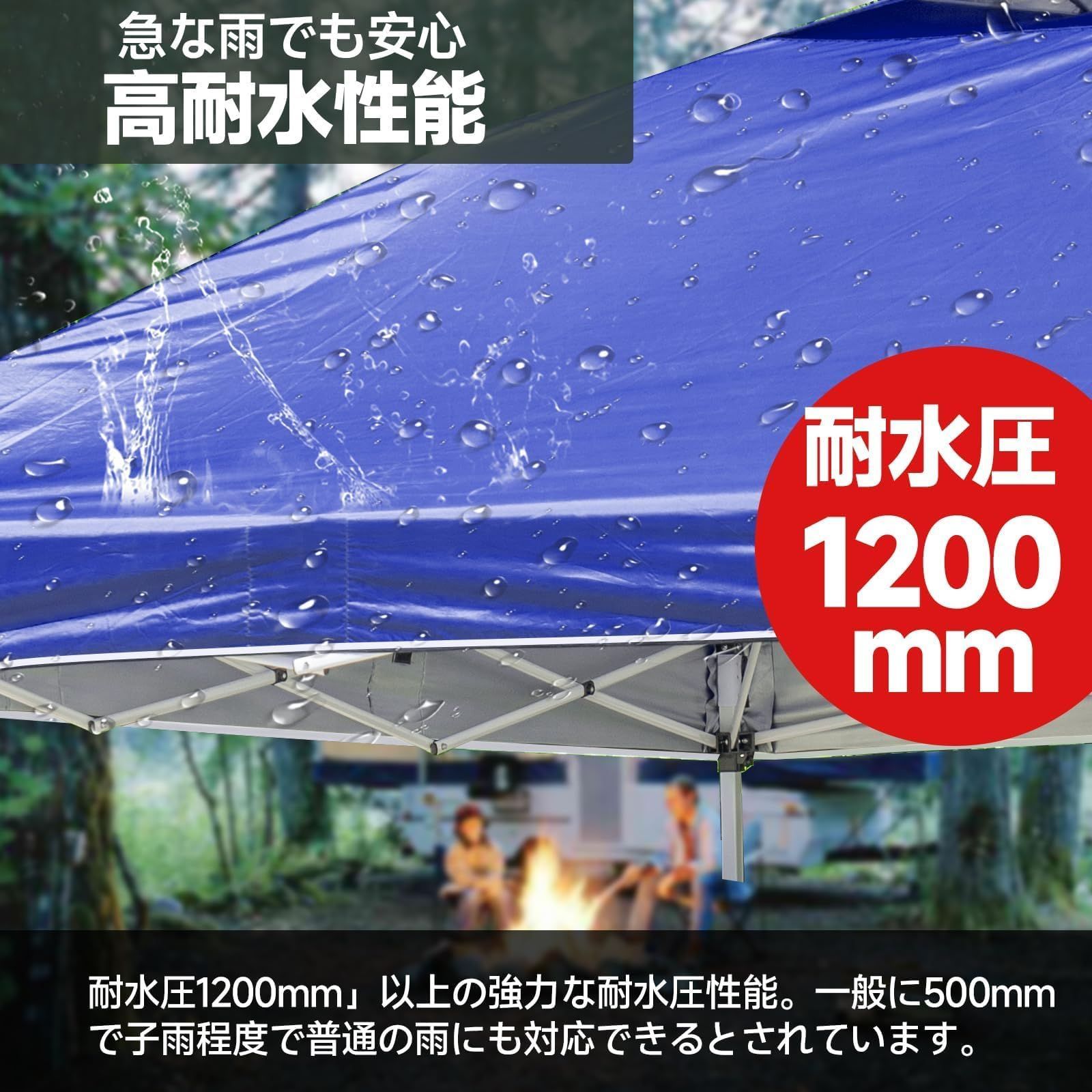 「耐水圧1200mm」以上の強力な耐水圧性能。一般に500mmで子雨程度で普通の雨にも対応できるとされています。テントの縫い目に「シーム加工」。生地の縫い目部分にシーム加工を施している為、縫い目からの雨漏れにも強い