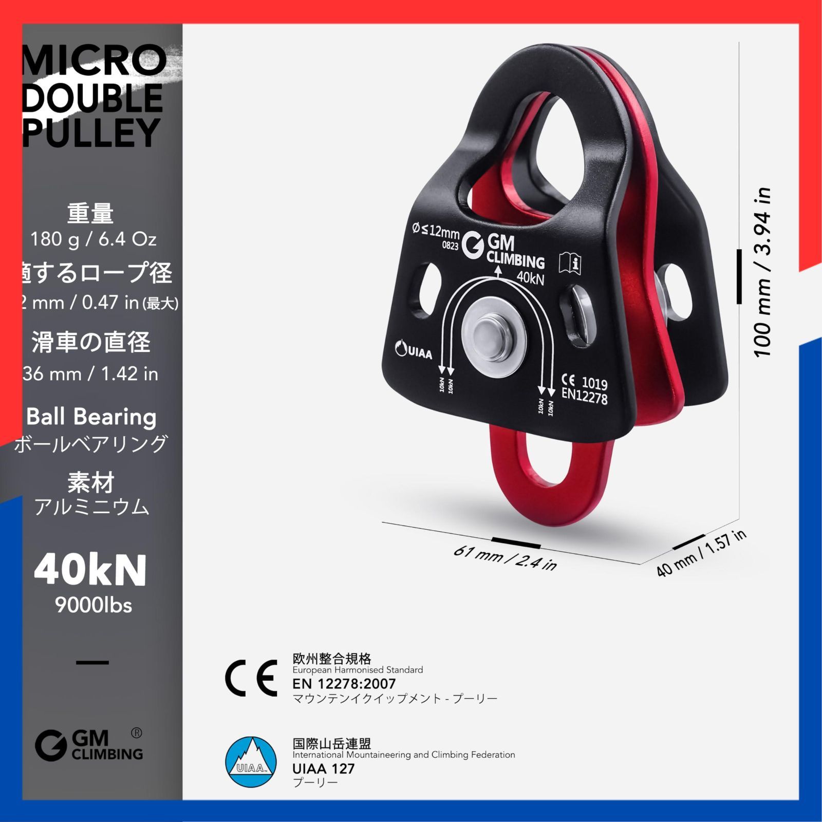 GM CLIMBINGの40kNマイクロダブルプーリーは、超コンパクトに製造され、軽量で耐久性に優れ、CEおよびUIAAにより認証済み、クライミング、レスキュー、倍力システム、リギングなど多目的に使用できます。