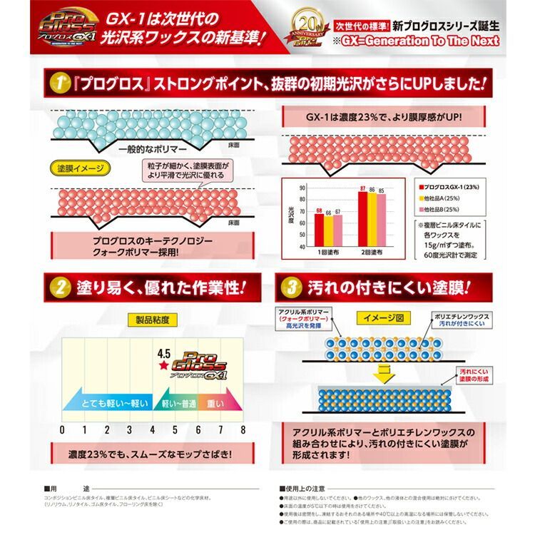 成分:アクリル系樹脂エマルション、高融点ポリエチレンワックスエマルション、可塑剤、アルカリ可溶性樹脂、レベリング剤、防腐剤、消泡剤、水