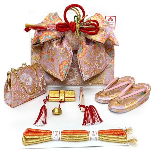7歳女の子用の古典柄の四つ身の着物に、結び帯とはこせこ小物セット・しごきや帯揚げをコーディネートし、その他着付けに必要な小物まで揃えたフルセットでの販売です。