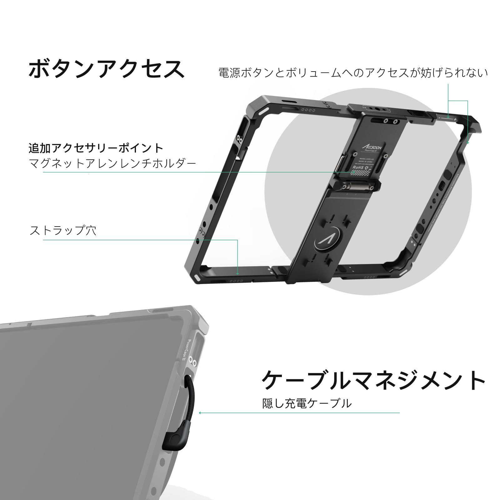 【幅広い互換性】 Accsoon iPad PowerCage II は調整可能なスライド式フレームを採用し、様々なサイズのiPadに対応します。Accsoon PowerCage II は、iPad - Gen 78910、iPad Air - Gen 345、iPad Pro - 10.5 inch 11 inch ( Gen 1234 ) に対応しています。