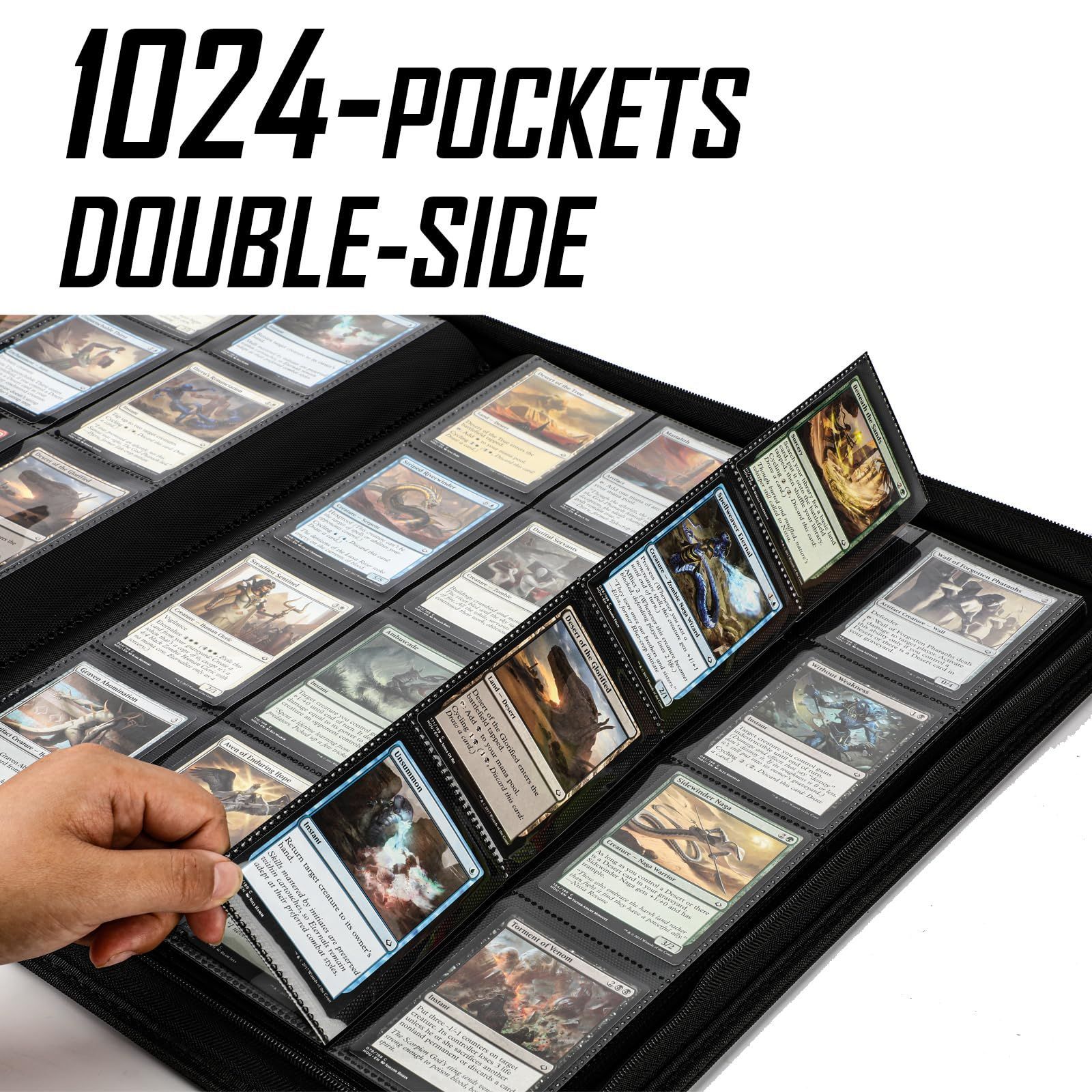 ByderPro1000個以上のポケットトレーディングカードバインダー、1024枚のトレーディングカードを収納可能 - 16ポケットリングレストレーディングカードアルバム トレーディング&スポーツカード用,TCG,レザー+ファスナー完閉|長期保存に最適な固定ページ&タグ付き