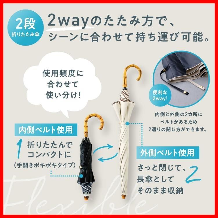 【長傘としても持ち運べる2WAY仕様の折りたたみ傘】 〈①骨をたたんで折りたたみ傘として使用〉〈②骨を伸ばしたまま長傘として使用〉 留めひもが内側と外側の両方にあるため、長傘としても持ち運ぶことが可能な2段式折りたたみ傘。 使用頻度に合わせて使い分けられる便利さが魅力です。