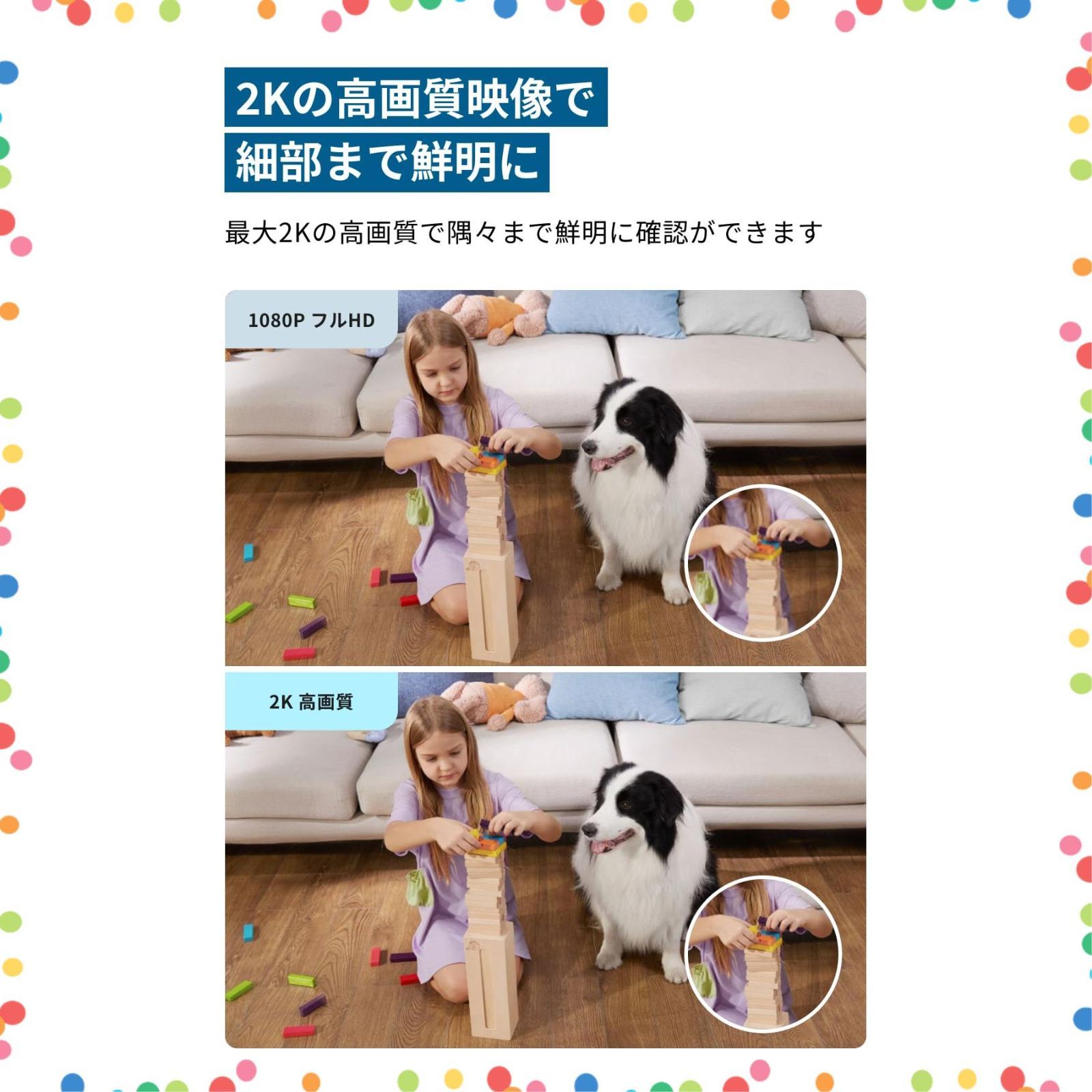 動作検知:本体に搭載されたAIが?やペットの動きを即座に検知し、?動で録画を開始してスマホに通知します。検知したい対象や範囲、通知?法等は在宅時 / 外出時等に分けて細かくカスタマイズできます。