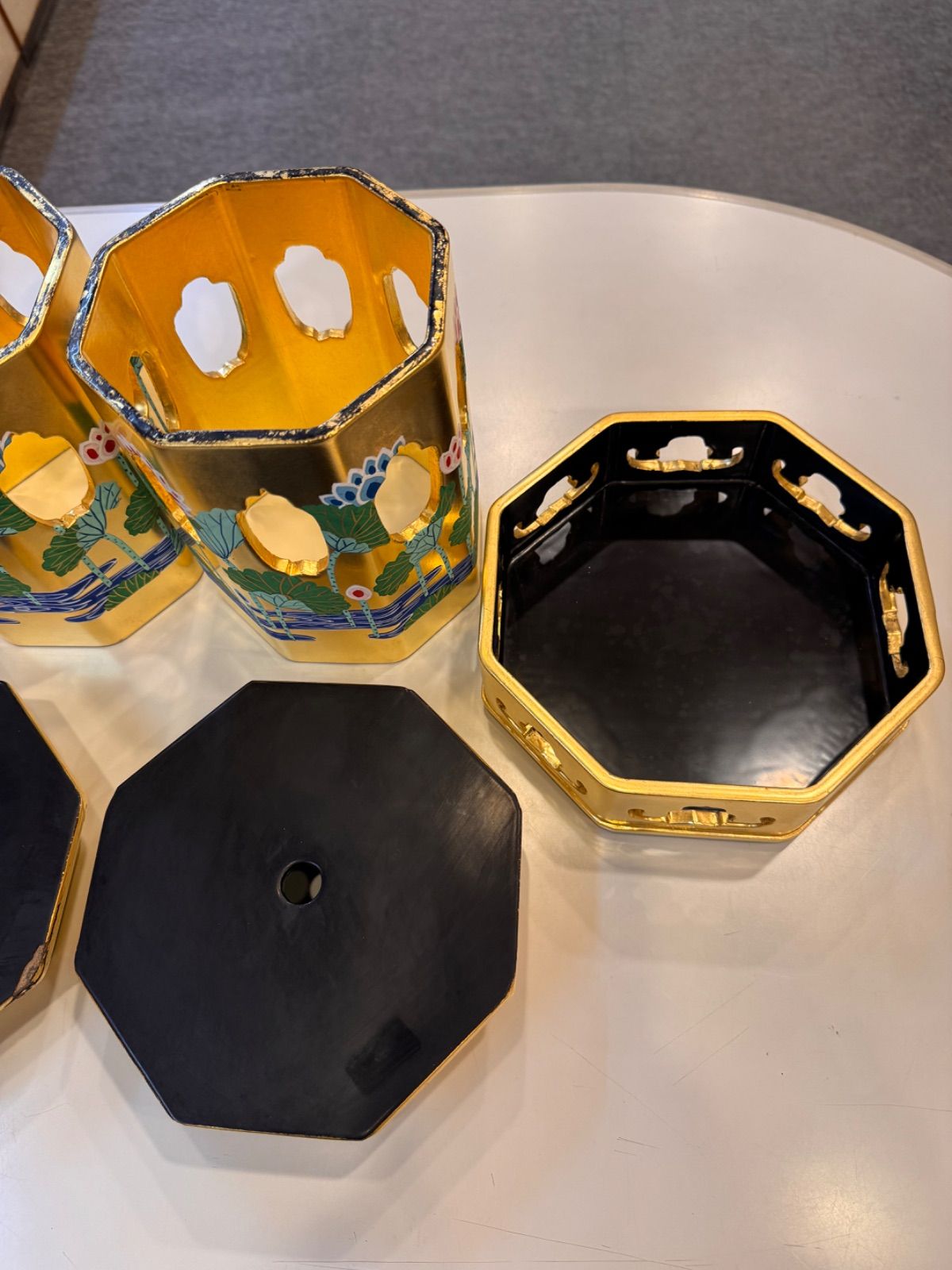 供笥 木製 八角 内外金箔押し 蓮水彩色