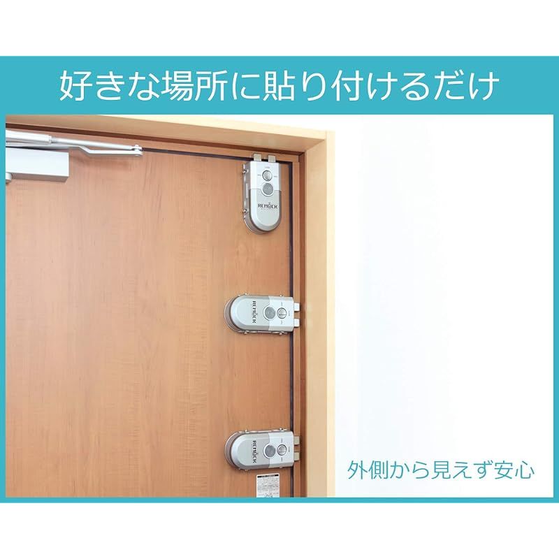 「鍵穴のないリモコンドアロックREMOCK」 ー安全は自分自身で守る時代です。-特徴■ 鍵穴がないリモコン式で、外側から取付け位置が全く予想できないためピッキングはもちろんサムターン廻しによる侵入犯罪からも100%身を守ります。■ 多くのご家庭に使われている単純な「ディスクシリンダー」タイプの玄関錠でも「REMOCK」があれば他人による侵入を完全に防げます。■ 鍵穴のないリモコン式だから熟練のカギ屋さんでも開閉不可能。完全なあなただけのプライベートルームが作れます。■最近多発しているキーに刻印されたキーナンバーのスキミングによる複製被害からもREMOCKなら無縁です。本体■ 特殊粘着シートを採用。ビス1本も使わず、わずらわしい取付け工事は一切不要。工事業者さんを呼ぶ必要もなくご自身で簡単に取付けができます。■ ドアを傷付けないから一般住宅はもちろん、賃貸マンションや事務所、店舗にも最適です。■ お引越しの際は取り外して移設も可能です。リモコン■ リモコン式だから小さいお子様や足の不自由なお年寄りの方まで、リビングから楽にドアの開閉ができます。■ とてもコンパクトな設計で、いつもの金属製のカギのように携帯にも非常に便利です。■ 2億6,000万通りの個別電波コードを採用しており、複製は不可能です。■ 万が一紛失した場合でも、すぐにご自身で登録を抹消でき安心です。■ 最大16個まで追加でき、大家族や多くの方がご使用される企業でも便利に使えます。安心設計■ 電池残量が少なくなるとランプが点滅し、施・解錠音が変わり、自ら交換時期をお知らせ。■ 電池交換をしなければ解錠はできても施錠ができなくなる安心設計。■ 「開けるとき」と「閉めるとき」を音で区別するので、閉め忘れを防止します。幅広い用途■ 事務所や店舗に幅広く設置でき、セキュリティ経費も大幅削減。もちろん自動ドアにも取付け可能です。■ 入居前にカギを交換しても、いまいち安心できない賃貸マンション。でも「REMOCK」なら絶対に誰も入れません。■ ここ最近急激に増えている勝手口からの空き巣対策にもバッチリ。REMOCKプレミアムサポート■万が一の故障でドアが開かなくなった場合にも24時間265日プレミアムサポートコールセンターが対応します。■緊急鍵開けサービスやドアの修理・復旧に掛かった費用を10万円までサポート。さらに近隣の方への謝礼品購入も補償します。