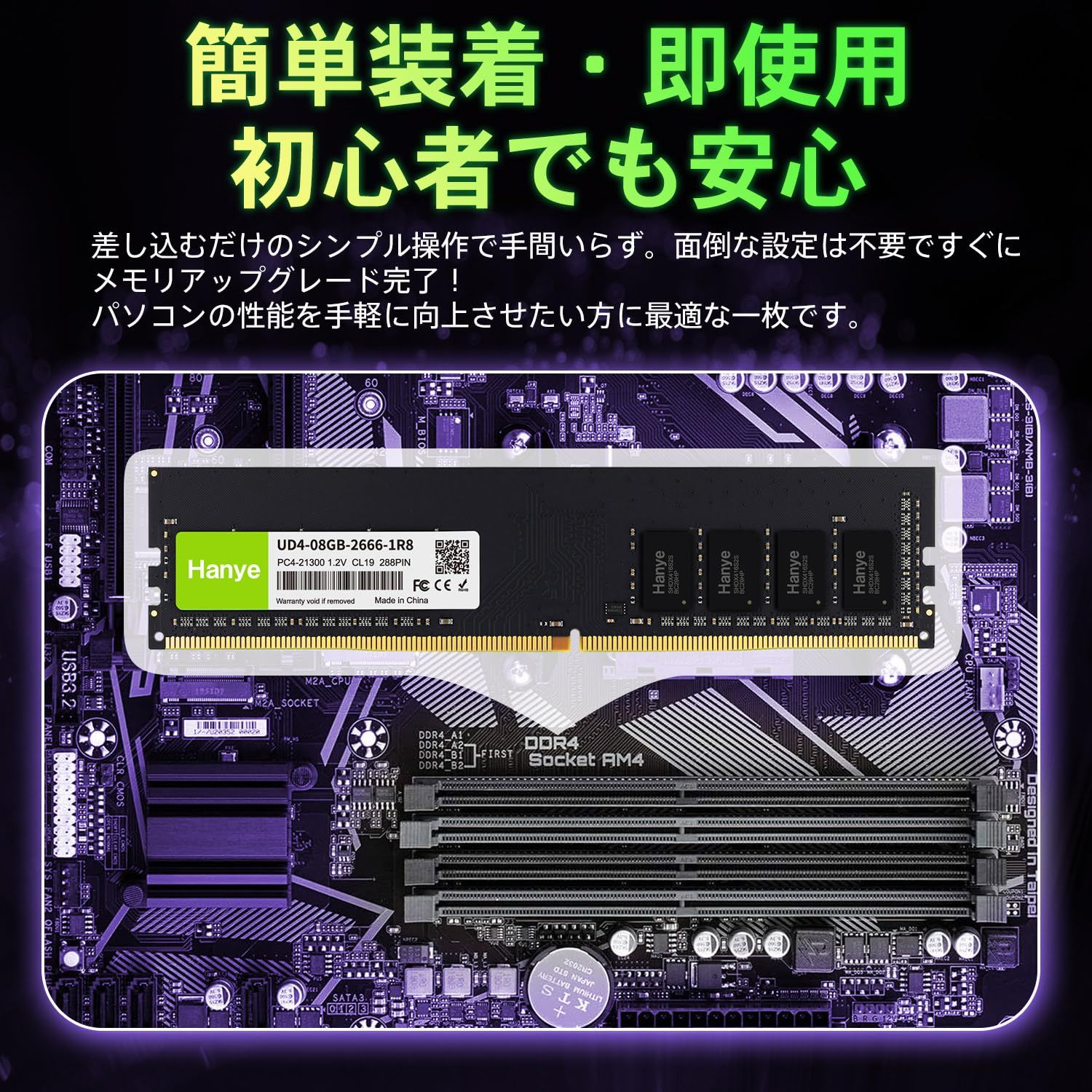 デスクトップPC用メモリ 16GB(8GBx2枚) PC4-21300(DDR4-2666) 288pin DIMM Hanye 1.2V CL19 UD4-08GB-2666-1R8 国内正規代理店品